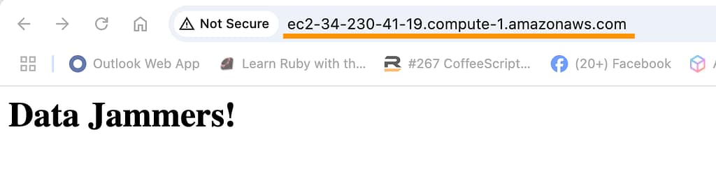 Not that this browser page loads via http (not https) over port 80. To enable https for security, an SSL certifcate group can be provisioned with AWS Certificate Manager, and traffic must be allowed on port 443.