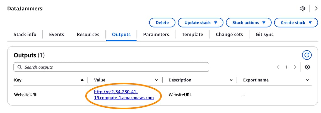 In the CloudFormation panel of the AWS console in the us-east-1 region the output of the DataJammers stack has an output listing the WebsiteURL of the deployed website.