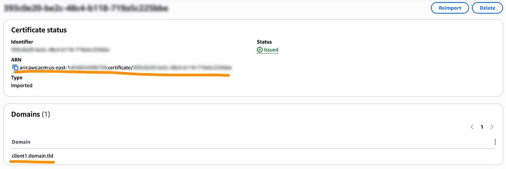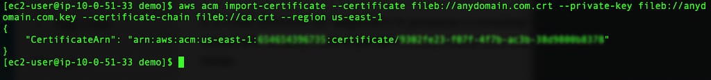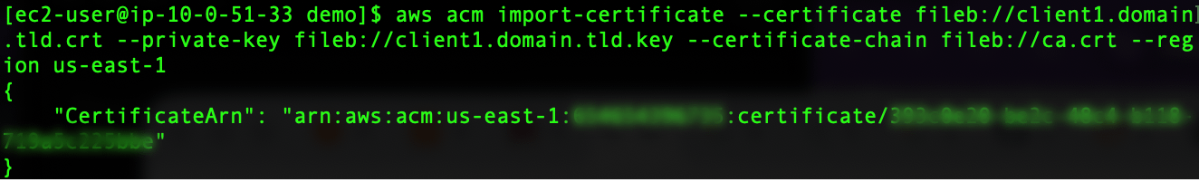 aws acm import-certificate --certificate fileb://client1.domain.tld.crt --private-key fileb://client1.domain.tld.key --certificate-chain fileb://ca.crt --region us-east-1