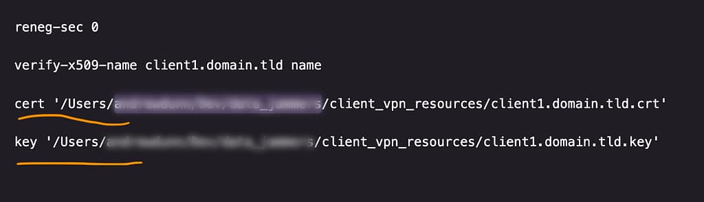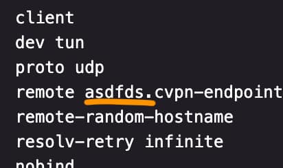 Open the file in your code editor and make three adjustments. First, near the top of the file, prepend a random string to the start of the remote DNS address. This creates a random subdomain, be sure to include the trailing period. Second, add two lines to the bottom of the VPN declaring the absolute paths the to client server and client key on your local machine.