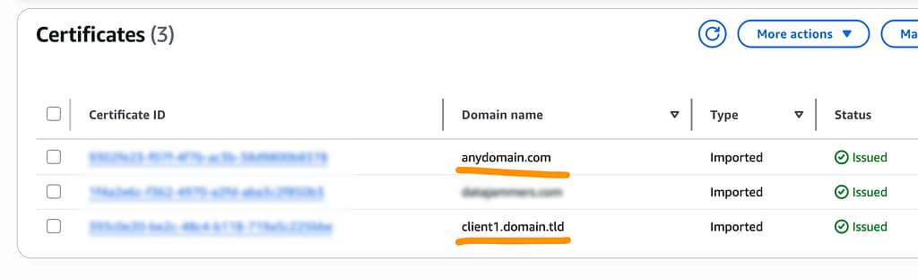 If you log into the AWS console and search for ‘Certificate Manager’, you should see the new certificates listed: