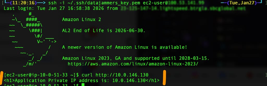 Once ssh’ed into the jumpbox, curl the private IPv4 of the application server.