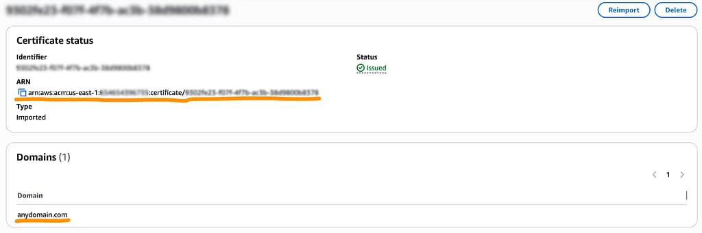 aws acm import-certificate --certificate fileb://anydomain.com.crt --private-key fileb://anydomain.com.key --certificate-chain fileb://ca.crt --region us-east-1