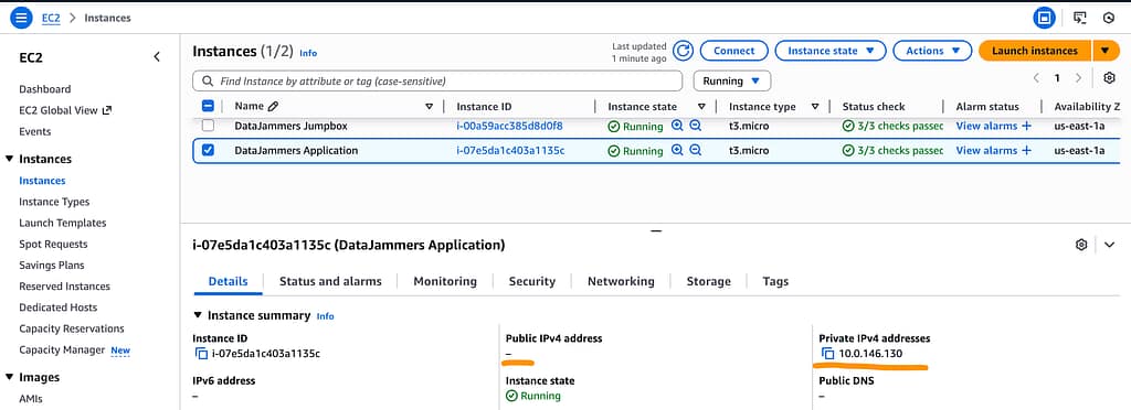 Within the AWS console, navigate to the EC2 page. You should see two instances listed now, the application server and the jumpbox. Click the checkbox next to the application server to see its details. Note the application server does not have an Public IPv4 address, so it will not be publicly accessible.
