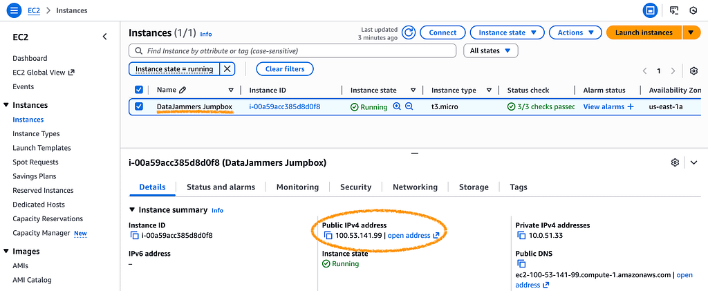 When the CDK script has run, you there will be a new EC2 Linux jumpbox in your account. Select that jumpbox and grab the public IP of the instance.