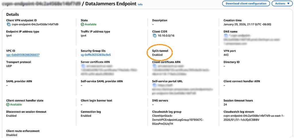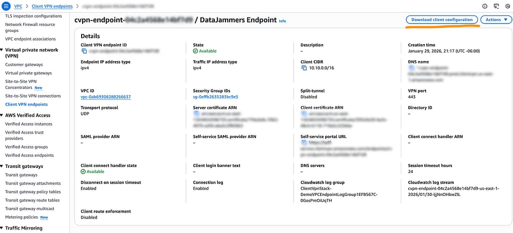 When the deployment is fully complete the new resources will include not only the VPN endpoint, but subnet associations, authorization rules and a log table. Navigate to the Client Endpoint (VPC > Virtual private network (VPN) > Client VPN endpoints) in the console to explore.