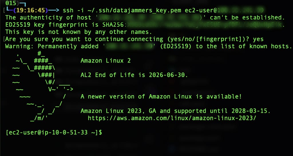 If successful, you will be asked if you are sure want to continue connecting. Enter ‘yes’. You should now see the command prompt on the LInux jumpbox, and its private IP. You are ‘ssh-ed in’.