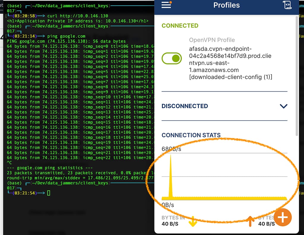 Observe the spike in the CONNECTION STATS. The spike occurs during the curl request. Before and after the ping request, the BYTES IN sits in a resting state. This proves that web-bound requests are not traveling through the client vpn. Load your favorite web page in a browser and it should function as normally, without extra lag.