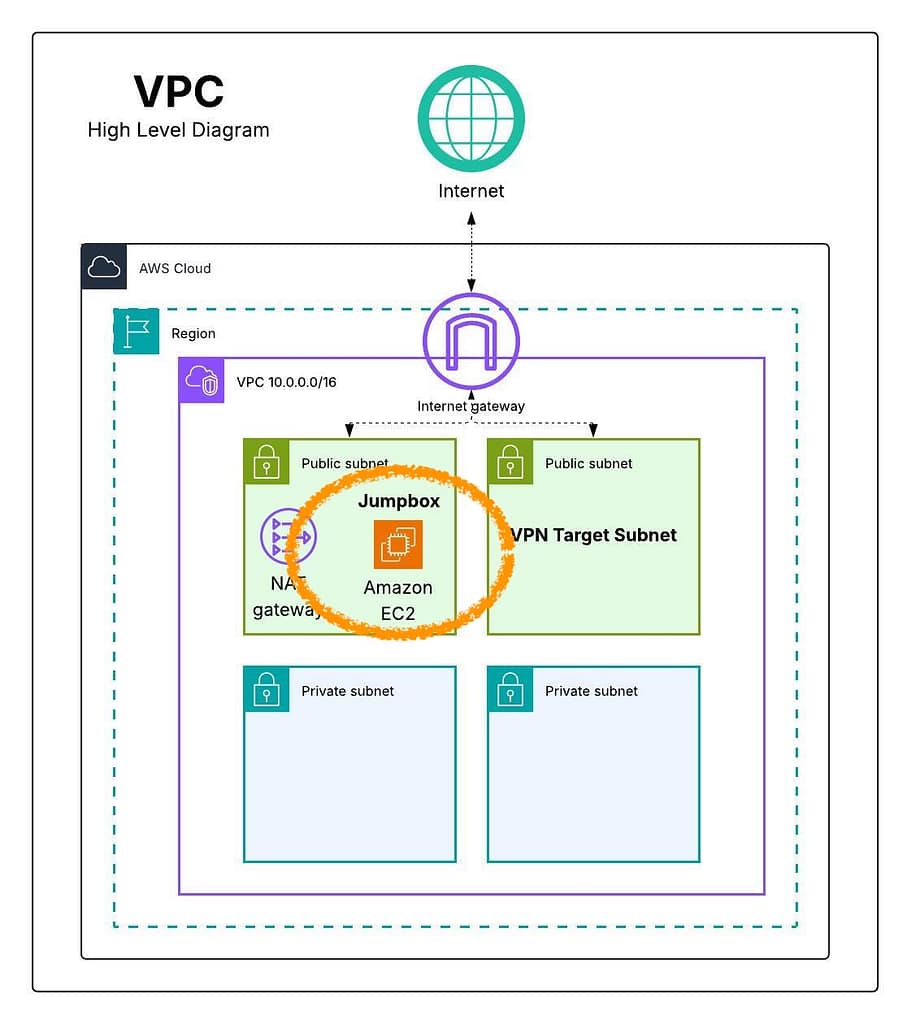 Note that this only internal traffic from the jumpbox to the application. If curl the internal url from a regular terminal session on our laptop without ssh’ing into the jumpbox first, the curl command will have no response. The application server is running, our VPC setup is nearly complete. We can move on to setting up the VPN endpoint.