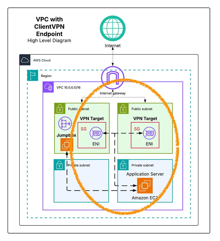 Let’s review the incoming changes to the target architecture. Both public subnets will contain an ENI (Elastic Network Interface) in a security group. Both subnets will be attached to the client vpn. An application-serving EC2 instance user sits in a private network, inaccessible by the public internet but accessible via the client vpn and the jumpbox.